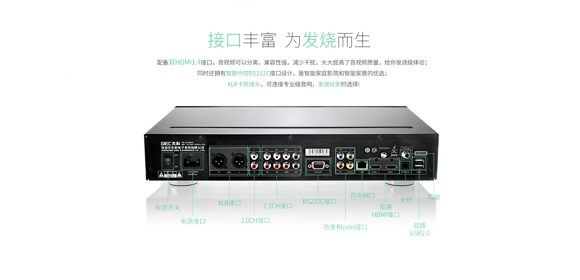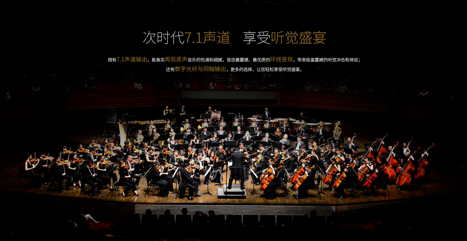 ![]() | 7.1CH、光纤、同轴、色差、双HDMI输出、双USB 2.0、RJ56百兆网口 |