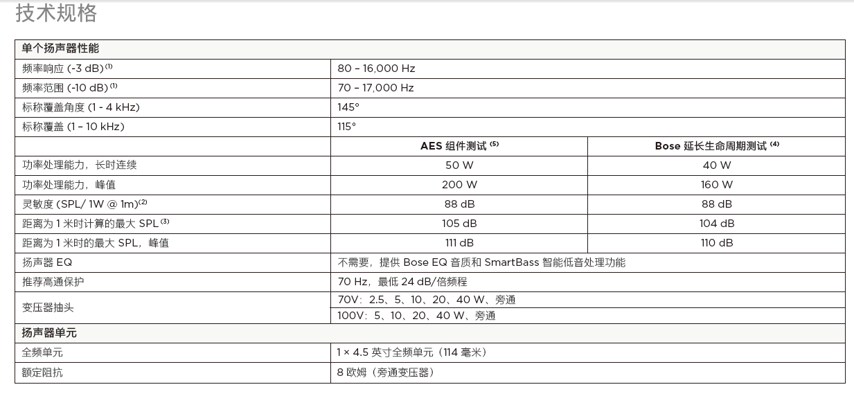 4.5 英寸全频单元,低频下限可达 70 Hz,可支持定阻(8 欧姆)和定压 (70/100V) 两种模式