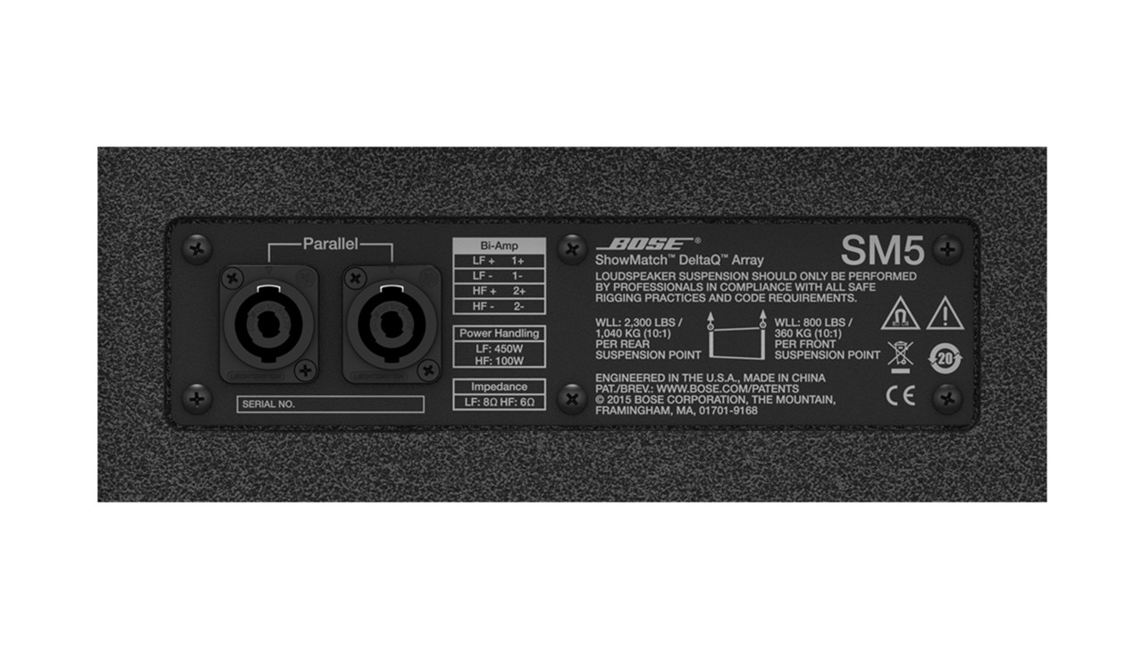 Bose Professional ShowMatch DeltaQ SM5 全频阵列模块提供 5° 标称垂直覆盖,包含可现场更换的 70° 或 100° 水平覆盖导波管以及可选的 55° 导波管配件。 更换单个导波管障板可形成水平非对称覆盖模式。 该二分频模块需要外接功率放大器(2 通道)和 DSP 可以提供 59 – 18,000 Hz 的全频响应,阵列输出峰值高达 145 dB。